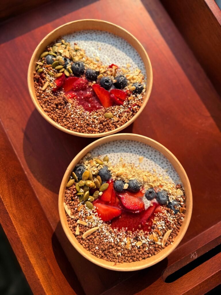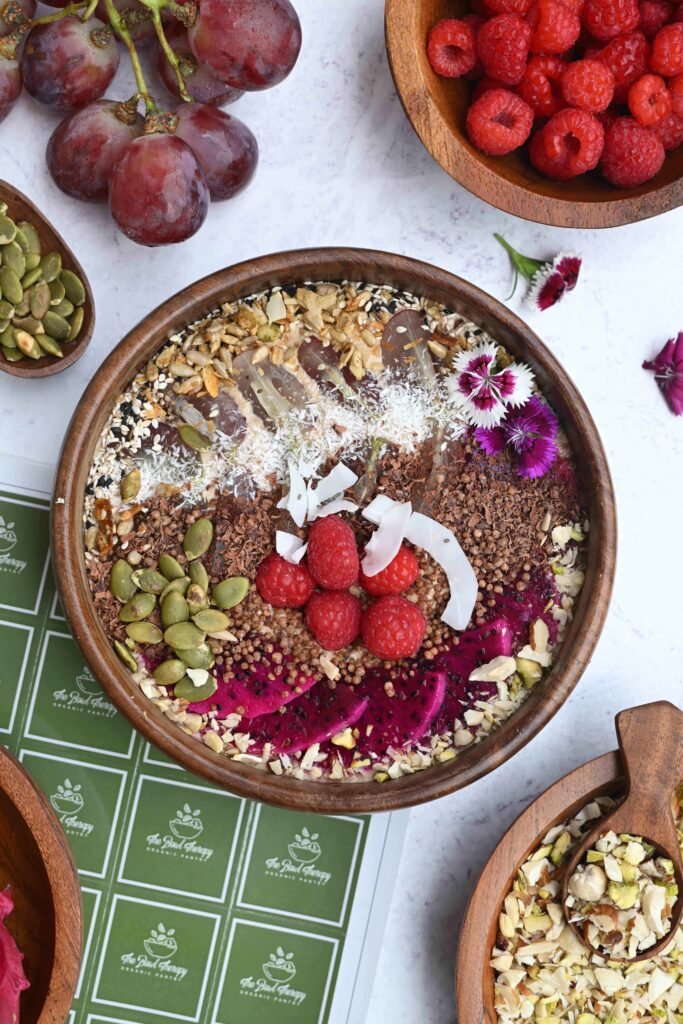 Wholesome bowls made with fresh fruits, superfoods, and almond milk healthy, delicious, and full of love.